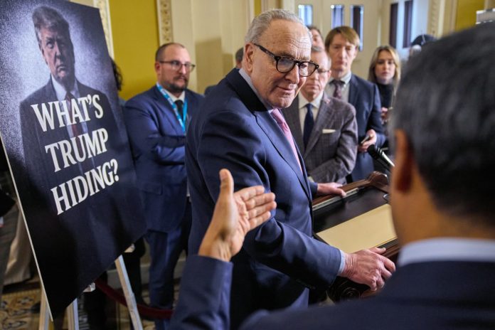 “Chuck Schumer is here looking very glum,” Trump joked as Schumer appeared to sink into his seat before cracking a slight smile.